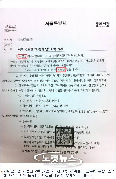 지난달 3일 인력개발과에서 직원들에게 보낸 '매주 수요일 가정의날 이행 철저'라는 제목의 공문에서도 '시장님 지시사항', '시장님 말씀'과 같은 표현이 등장하고 있다.