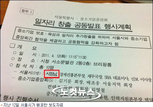 참석자 10명 가운데 오 시장만 진한 글씨체로 '시장님'이라고 적혀 있는 반면 나머지 참석자들은 김기문 (중소기업중앙회) 회장, (서울시) 경제진흥본부장 등으로 표기돼 있기 때문.