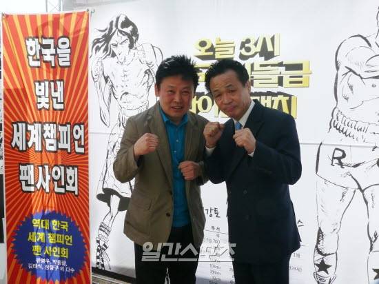 장정구와 유명우는 16일 오후 부천 한국만화영상진흥원 야외 만화광장에서 열린 한국 미들급 타이틀 매치에 참석해 '권투만화 명장면' 전시를 보고 만화팬 및 복싱팬을 상대로 사인회를 가졌다.