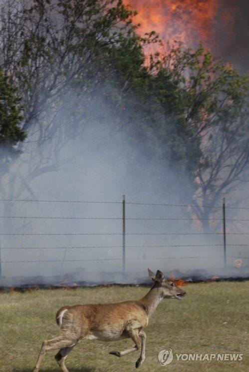 (AP=연합뉴스) 미국 텍사스주에서 산불이 계속 번져가는 가운데 19일(현지 시각) 텍사스주 포섬 킹덤의 벌판에서 사슴 한 마리가 불길을 피해 달아나고 있다.