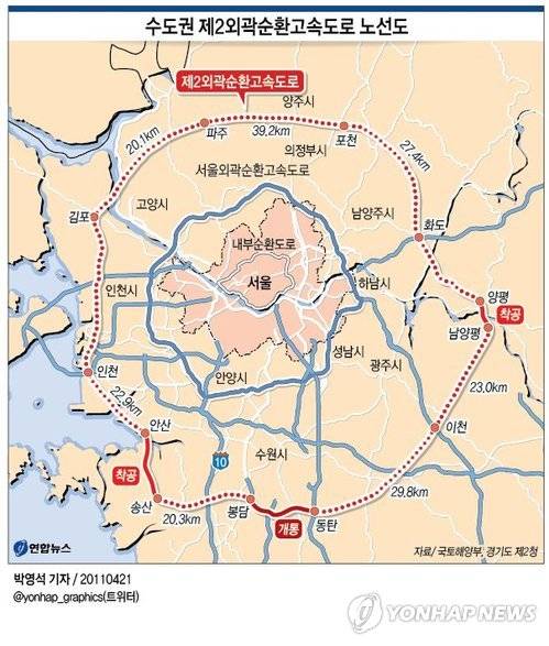(서울=연합뉴스) 박영석 기자 = 21일 국토해양부와 경기도 제2청(경기도2청)에 따르면 2020년 완공 목표인 수도권 제2외곽순환고속도로 263.4㎞ 가운데 북부구간은 105.3㎞(왕복 4차로)로, 총 3조2천억원을 들여 김포~파주~포천~남양주 화도~양평 등 4개 구간으로 나뉘어 건설된다.