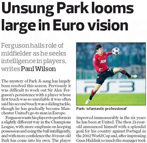 영국 일간지 '가디언'의 주말판 '옵저버'는 24일자에서 UEFA챔피언스리그에서 박지성의 활약을 조명했다. 신문은 "박지성이 이제 어엿한 맨체스터 유나이티드의 주전"이라며 박지성의 공헌을 높이 평가하는 동시에 알렉스 퍼거슨 감독의 칭찬도 소개했다.