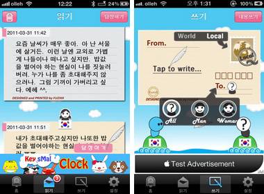 쓰기에서는 누군가에게 보내질 엽서를 작성한다. 엽서 내용은 마음대로 적어도 된다. 상대방에게 보여 지는 정보는 성별과 국가가 전부이기 때문이다. 엽서는 무작위로 보내지지만 간단한 설정은 가능하다.