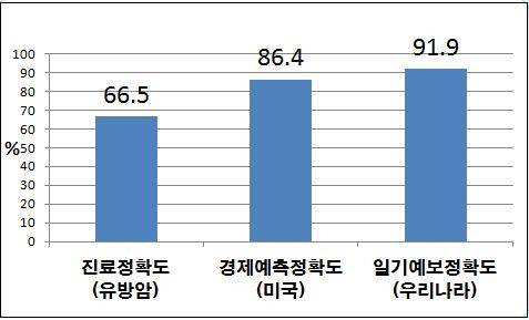 밥 먹듯이 항상 접하는 일기예보의 정확도는 얼마일까. 기상청 발표에 의하면 2010년 일기예보 정확도는 91.9%였다. 오차율이 8.1%에 불과하다. 변화무쌍한 대기의 흐름을 예측하는 일기예보의 정확도가, 최첨단 장비로 몸속을 관측하는 의사보다도, 방대하고 확실한 초기자료를 분석하여 경제를 예측하는 이코노미스트보다도 더 정확하다.