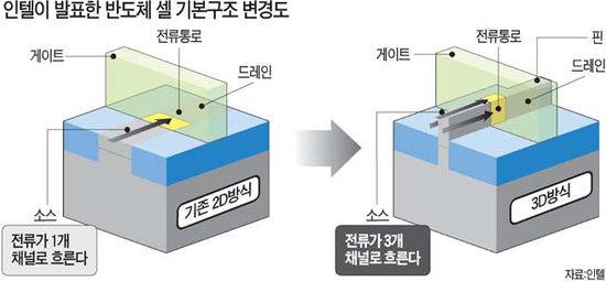 기존 반도체 트랜지스터는 소스와 드레인이 서브 실리콘(sub silicon) 아래에 묻혀 있는 방식으로 제조됐다. 인텔이 개발한 트랜지스터의 가장 큰 특징은 소스와 드레인을 게이트와 함께 서브 실리콘 위로 돌출시킨 3차원 구조로 형성됐다는 점이다. 기존 2차원 방식에선 전류가 흐르는 채널이 1개만 형성된 것에 비해 3차원 방식에선 채널이 3개가 만들어지게 됐다. 업계 관계자는 "채널 수가 증가하면 흐르는 전류량이 많아지면서 그만큼 전류 누출량(leakage)을 줄일 수 있는 효과가 생긴다"고 설명했다.