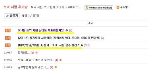 ▲ 다음카페 '닥치고 취업'에 토익 난이도 투표와 토익 자동점수 환산기에 대한 게시물이 게재돼 있다. |