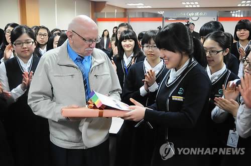 (서울=연합뉴스) 6·25 참전 영국 노병 제임스 그룬디(80)씨가 6일 부산 예문여자고등학교를 방문, 학생들과 즐거운 시간을 보내고 있다. 그룬디씨는 현재 척추암이 악성림프종으로 번지면서 힘든 투병 생활 중이지만 지난해부터 편지를 통해 소중한 인연을 맺어왔던 예문여고 학생들과의 만남을 위해 한국을 찾은 것이다. 2011.5.6 < < 부산 지방 보훈청 > >