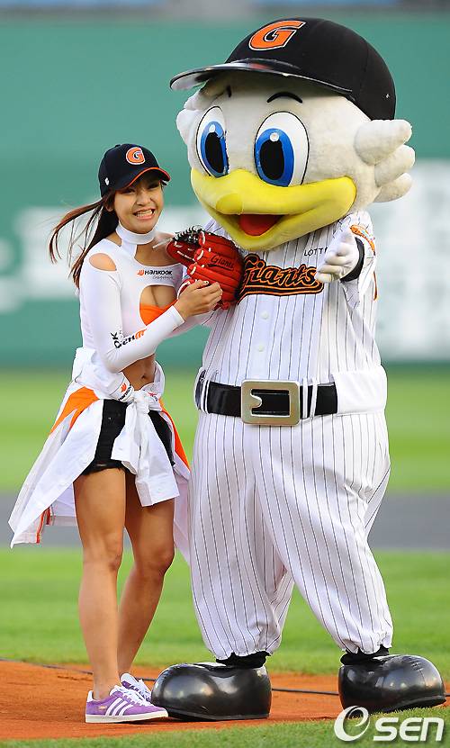[OSEN=부산,박준형 기자] 13일 오후 부산 사직구장에서 열리는 '2011 롯데카드 프로야구' 롯데 자이언츠와 KIA 타이거즈의 경기 전 레이싱모델 전유현이 시구를 마치고 롯데 마스코트 누리에게 안겨 쑥스러워하고 있다. / soul1014@osen.co.kr