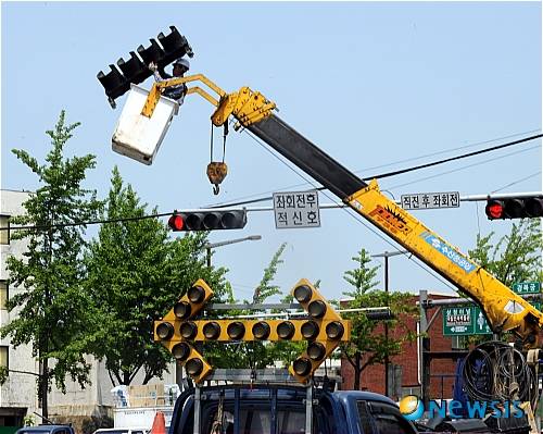 【서울=뉴시스】박태홍 기자 = 17일 오후 서울 종로구 동십자각 앞에서 서울시 관계자가 전국 53곳의 교차로에 설치된 3색 신호등을 철거하고 기존 4색 신호등으로 교체 작업하고 있다.