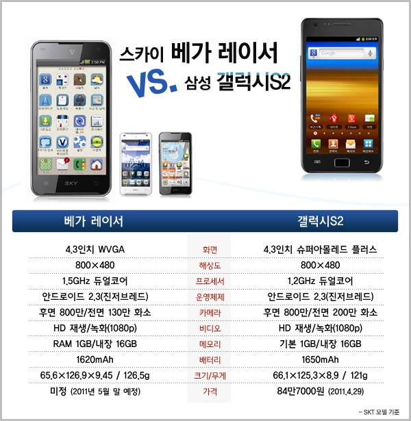 이날 공개한 베가 레이서는 2세대 베가인 베가X와 베가S에 비해 한 단계 업그레이드된 제품이지만 1.5GHz 듀얼코어 CPU를 빼면 지난달 말 삼성전자에서 출시한 갤럭시S2 사양과 별반 차이가 없다. 4.3인치 액정화면 크기나 800만 화소 카메라, 1GB DDR2 RAM, 16GB 내장 플래시 등 메모리 용량까지 동일하다. 다만 두께와 무게는 갤럭시S2에 조금 못 미친다.
