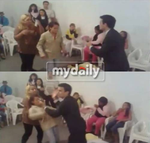 마이크를 들고 있는 목사는 장풍 날리는 흉내 이외에도 실제 신도를 손으로 밀어 넘어뜨리는 모습도 눈에 띄었다.