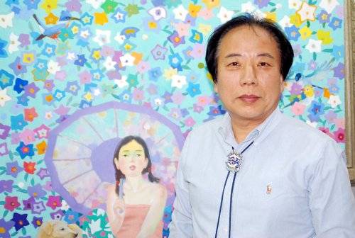중국으로 유학을 떠나는 큰딸의 무운을 담아 그린 '동행' 등 근작들에선 여인과 함께 도라지꽃이 활짝 핀 그림들을 많이 볼 수 있다. 도라지꽃의 수수함과 다양한 색깔에 반해 도라지꽃은 요즘 그의 작품에 약방의 감초처럼 빠지지 않는다. 형형색색의 도라지꽃들은 선명하고 강한 색채로 붓질이 돼 마치 하늘의 은하수가 쏟아지는 듯한 착각이 들 정도다.