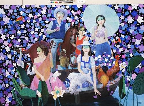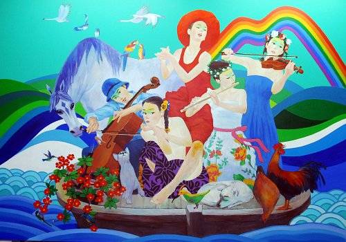 화실 벽면 중앙에는 200호 크기의 신작이 놓여 있었다. 작은배에는 가족인 듯한 다섯명의 남녀가 음악을 연주하고 있다. 모두들 상기된 표정이다. 붉은 모자, 붉은 원피스의 성숙함이 풍겨오는 여인은 행복한 미소를 머금은 채 박수를 보낸다. 각종 새들이 날고 졸음에 겨운 강아지와 고양이 등 애완동물이 등장하고 수탉과 백마도 흥겨운 선율에 빠져들고 있다.