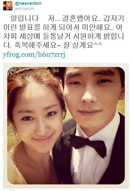 5월24일 전혜빈은 자신의 트위터에 "알립니다. 저 결혼했어요. 갑자기 이런 발표를 하게 되어서 미안해요. 어차피 세상에 들통날 거 시원하게 밝힙니다. 축복해주세요. 잘 살게요"라는 글과 함께 사진 한 장을 게재했다.