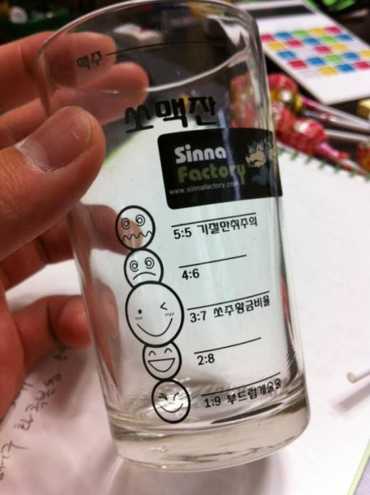특히 이 컵에 적혀있는 '1:9 부드럽게 술술', '3:7 쏘주황금비율', '5:5 기절만취주의' 등 기발한 문구는 보는 이로 하여금 웃음을 자아낸다.