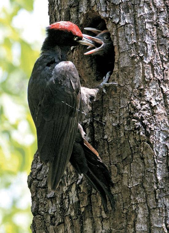 천연기념물 242호인 까막딱따구리가 경기도 포천 국립수목원에서 새끼에게 먹이를 먹이고 있다. 까막딱따구리가 둥지로 선택한 나무는 수목원에서도 사람들이 가장 많이 모이는 '휴게광장'의 참나무. 사람을 피하는 새들이 민가나 사람이 많이 모이는 곳에 둥지를 트는 이유에 대해 윤무부(70·조류학) 박사는 "구렁이나 족제비 등의 천적으로부터 안전하기 때문"이라고 설명한다. 국립수목원에서는 참나무 주변에 보호망을 설치해 까막딱따구리를 보호하고 있다.