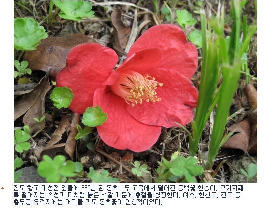 진도읍 읍성 뒤편에 진도향교가 자리잡고 있다. 임진왜란 당시 진도향교에 왜병이 쳐들어왔을때 유림 김희남이 피난하면서 명륜당 기둥에 "천하에 어찌 공자의 도가 없겠는가 (天下豈無夫子道)"라는 글귀를 남기고 떠나자 그 뒤 왜병들이 향교에 침입하여 불태우려다 이 글귀를 보고 경탄하여 그 글귀 옆에 "이 곳에도 충렬의 선비가 있구나(此地亦有忠烈士)"라는 글로 화답하고 후퇴했다는 옛 이야기가 전해지고 있다. 대성전 옆 뜰에는 330년 된 동백나무 고목이 그 유서깊은 역사를 드러냈으며, 연초록 풀밭 위에 붉은 동백꽃 한송이만 모가지째 떨어져 빛나고 있었다. 그 선연한 동백꽃의 자태는 진도 정유재란 순절묘역에 잠들어 있는 진도 민초들의 영혼인 듯하였다.