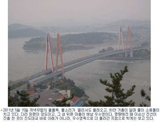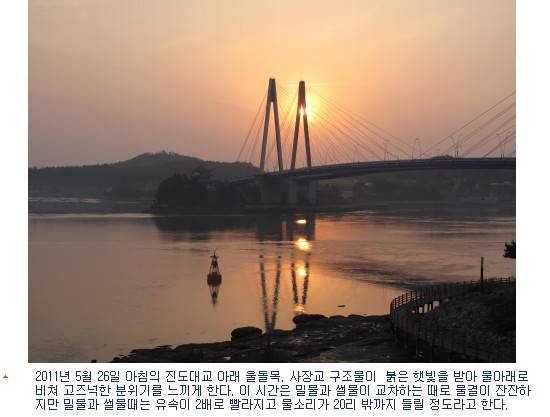진도대교 아래를 흐르는 울돌목에 이르자 과연 물의 소용돌이가 보였고, 그 세차게 소리가 귓전에 울렸다. 그곳에는 4천가구에 전기를 공급할 수 있는 조력발전소가 가동되고 있다. 2007년 4월 이 발전소에 설치할 7백톤짜리 발전용 터빈을 싣고가던 바지선이 평소 유속의 두배인 시속14km의 밀물 조류에 휩쓸려 진도대교에 부딪히는 사건도 있었다.