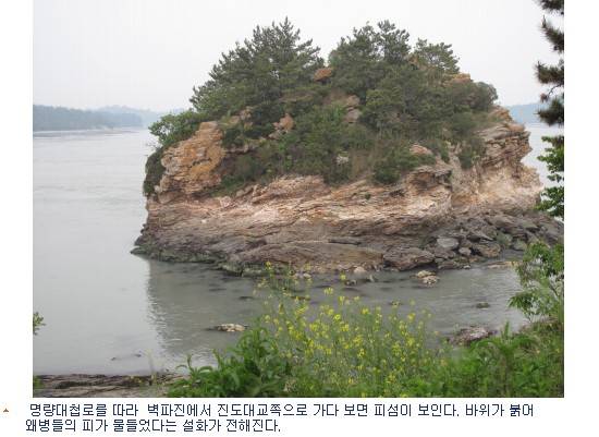 벽파진을 떠나 울돌목까지 가는 5km에 이르는 해안도로는'명량대첩로'라는 명칭이 붙여졌다.오후 5시40분쯤 바라본 그곳 바다는 썰물때였는지 갯벌이 속살을 드러냈고, 바로 건너편 해안 산기슭이 지척에 있어 기다란 협수로임을 실감케 했다.진도대교 가까운 쪽에 이르자 피섬이라 불리는 조그만 섬이 보였다. 바위가 왜구들의 피로 물둘어 붉게 물들었다는 설화가 전해진다.