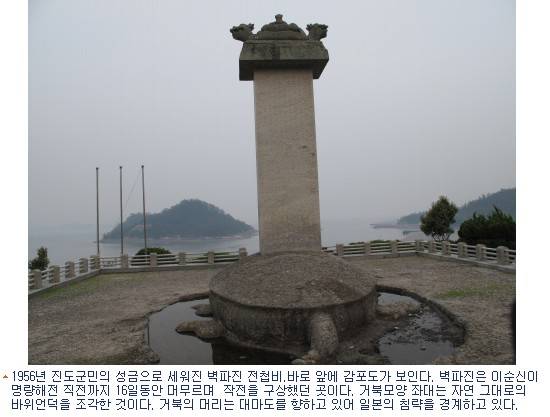 2011년 5월 15일.아침에 흐리다가 낮에 맑게 개임.오후 2시쯤 울돌목이 흐르는 진도대교에서 동쪽으로 5km 떨어진 벽파진 언덕에 이르자 벽파진 전첩비가 위용을 드러냈다. 언덕 위에 솟은 자연 그대로의 바위산 꼭대기를 거북모양으로 깎아 좌대를 삼았으며, 화강석으로 비를 세워 높이가 11.8미터에 이른다.1956년 진도군민의 성금으로 세웠으며, 명량대첩 그날의 전적을 이은상의 글과 손재형의 글씨로 새겼다." 삼백척 적의 배들 산같이 깔렸더니 울돌목 센 물결에 거품같이 다 꺼지고 북소리 울리는 속에 저 님 우뚝 서 계시다. 거룩한 님의 은공 어디다 비기오리. 피흘린 의사혼백 어느 적에 사라지리.이 바다 지나는 이들 이마 숙이옵소서." 나를 안내한 관광해설사 허상무씨는 이곳에서 진혼곡을 구성진 육성으로 들려주었다.
