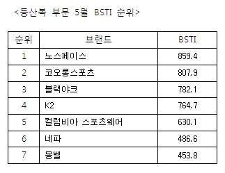 브랜드 가치 전문 평가 회사인 브랜드스탁의 5월 BSTI에 따르면 등산복 부문에서 노스페이스가 859.4점으로 1위를 달리고 있고 코오롱스포츠(807.9점)와 블랙야크(782.1점)가 각각 2, 3위에 올랐다.