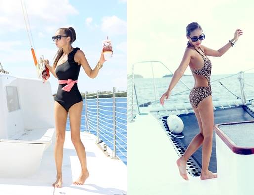비키니가 부담스럽다면 가슴을 완전히 덮거나 어깨, 허리를 강조한 수영복을 착용해보자. 이는 화려한 디테일 못지않게 시선을 분산시켜 준다.