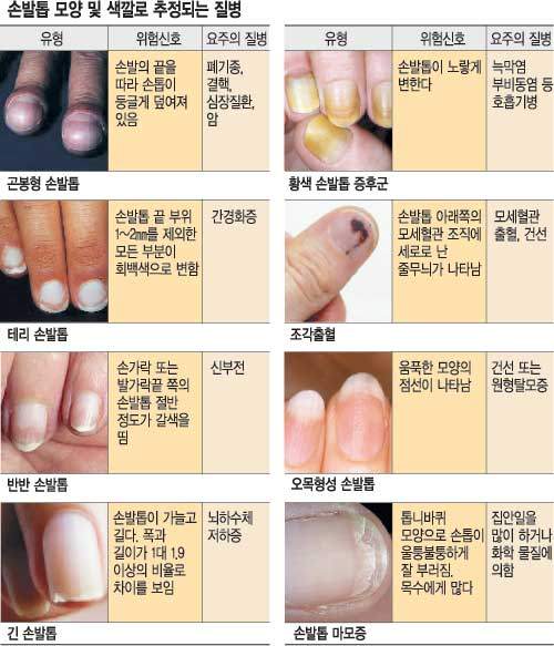 또 손발톱이 두꺼워지거나 끝 부위가 잘 부스러지면 무좀을 일으키는 곰팡이 균에 감염돼 있다는 신호다. 영양 부족이나 신경 계통에 이상이 있으면 손톱 끝이 얇고 하얀 달걀껍질처럼 변하기도 한다. 중심부가 함몰되는 양상의 오목형성 손발톱은 건선을 앓을 때 나타나는 한 증상이다.