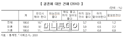 27일 통계청이 발표한 '2011 통계로 보는 여성의 삶' 보고서에 따르면, 결혼에 대해 미혼여성의 47.1%는 '해도 좋고 하지 않아도 좋다'라고 생각하는 비율이 가장 높았다. '꼭 해야 한다, 하는 것이 좋다'는 의견은 46.3%였다.