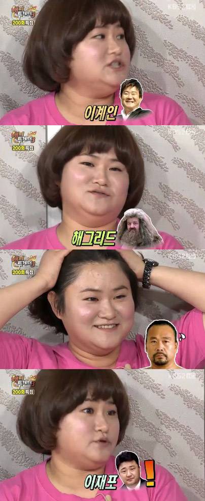 김신영은 이계인을 비롯한 이재포, 이왕표, 심지어 '해리포터' 주인공 해그리드와 닮았다는 소리를 들었다며 직접 머리를 뒤로 넘기며 이를 증명했다.
