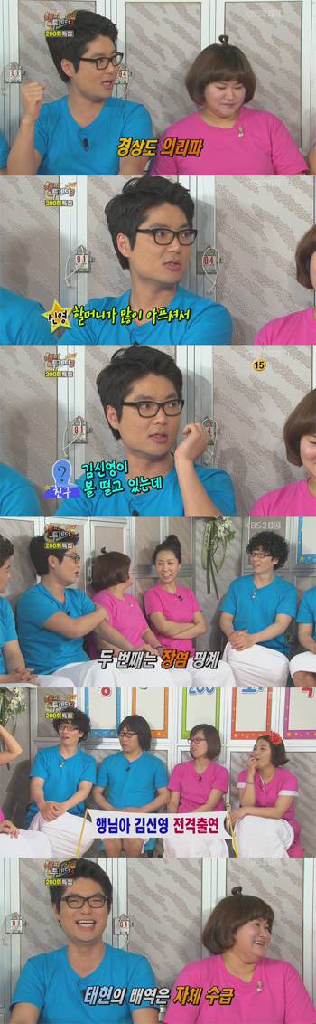 김태현은 또 "장염 때문에 입원했다길래 쉬라 그랬던 적이 있다"며 "나도 놀러가려고 국도를 달리는데 '행님아 김신영 전격출연' 플랜카드가 걸린 걸 봤다"고 말을 이었다. 김태현의 폭로에 김신영은 찔리는 듯 무안한 미소만 짓고 있었다.
