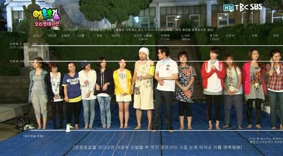이 사진은 SBS '일요일이 좋다-영웅호걸' 캡처 컷으로 영웅호걸 멤버들의 정확한 키를 비교 분석했다. 이유는 멤버들이 모두 맨발로 매트에 올라 서 있어 키를 비교하게 쉬웠기 때문.