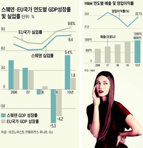 스웨덴은 어떻게 강한 성장 동력을 유지할 수 있었을까? 스웨덴 스톡홀름 증권시장에서 볼보를 대체한 성장 동력을 발견할 수 있다. 2005년 볼보, 2007년 에릭슨을 뛰어넘어 스톡홀름 증시의 시가총액 1위(570억달러)에 올라선 패션기업 H&M(Hennes & Mauritz). 지난 5년간 연평균 매출액(154억달러)에서 세계 패스트패션업계 1위. 연평균 영업이익률(23.3%)은 세계 최강으로 꼽히는 애플(21.7%)을 넘어섰다.