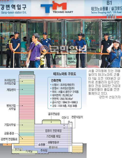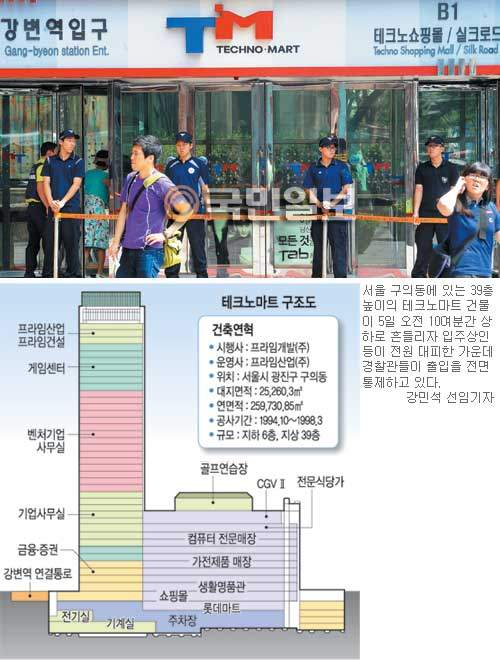 ◇테크노마트는 어떤 건물=테크노마트는 지하 6층, 지상 39층의 복합 전자유통센터다. 대지면적 2만5260㎡, 연면적 25만9731㎡로 1994년 10월 착공해 98년 3월 완공됐다. 지하철 2호선 강변역 근처에 위치한 유리한 입지, 국내 최초의 멀티플렉스 영화관 도입, 전자상품 위주의 구성으로 개장 이후 순식간에 서울 동부 한강변의 랜드마크 빌딩이 됐다. 평일 유동인구 3만∼4만명, 주말 5만∼6만명에 이르며 상주인원은 3000명 정도다.