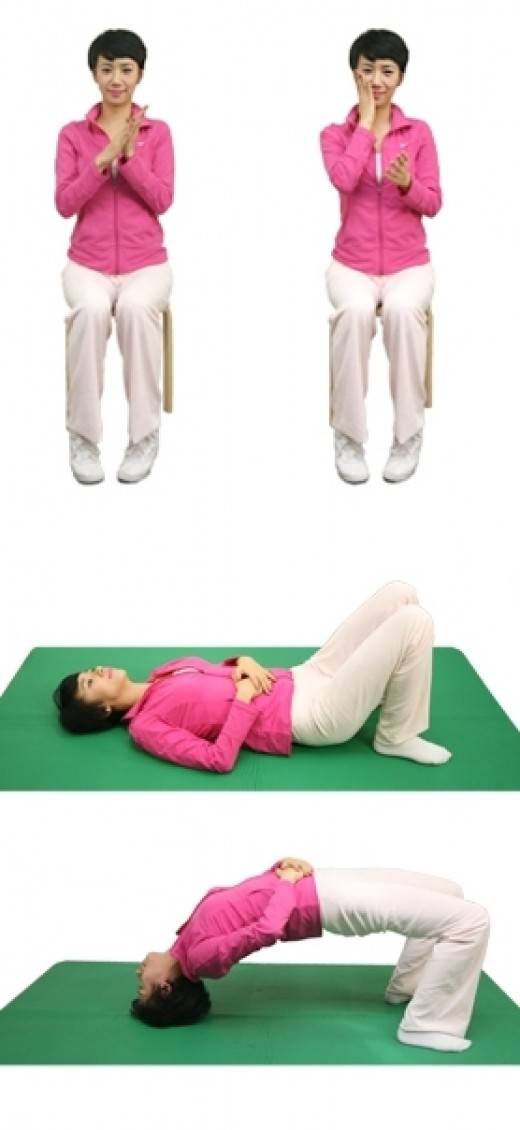 바닥에 누워서 하는 자세도 있다. 두 발을 세우고 두 손을 배위에 올린 후 발끝과 머리를 바닥에 대고 몸 전체를 들어준다. 경추나 척추에 이상이 있는 분들은 하지 않는다.