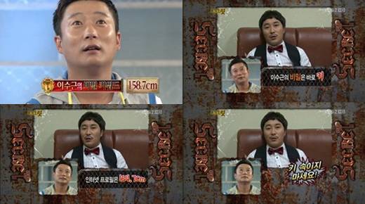 이날 방송에서 김병만은 "이수근이 평소 자신의 키를 166cm라고 말한다"며 "인터넷프로필 상에는 164.7cm라고 게재되어 있지만 알고 보면 158.7cm다"라고 폭로했다.
