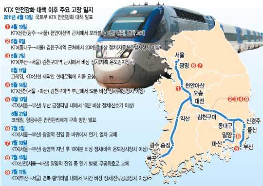 KTX 비상 정차 사고가 속출하면서 정부의 안전대책이 무용지물이라는 지적이 제기된다. 국토부는 지난 4월 KTX 안전강화 대책을 발표했다. 코레일도 지난달 자체적으로 안전관리 체계 구축 방안을 내놨다. 차량과 선로의 관리 체계를 강화하고, 차량 부품 교체 주기를 짧게 하는 등 항공기 수준으로 안전 점검을 하겠다는 내용이다. 그러나 국토부의 대책 발표 이후에도 KTX는 10여 차례나 비상 정차했다.