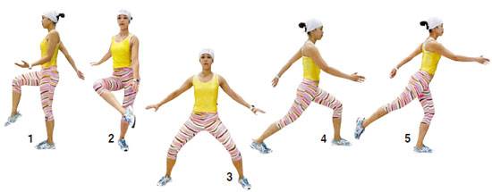 4 크로스 컨트리 스키 두발을 동시에 앞뒤로 벌려뛰었다 다시 반대로 교차시킨다. 양팔도 교대로 앞뒤로 뻗어준다. 운동효과 허벅지 군살빼기, 상체의 근육 강화