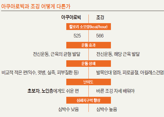 아쿠아로빅은 물에서 즐기는 에어로빅이다. 걷기·뛰기·틀기·차기 같은 에어로빅의 기본 동작부터 막대나 튜브를 이용한 다양한 춤동작을 모두 물속에서 한다. 수영을 못해도 할 수 있어 중년 이후 여성에게 권할만하다. 차움 재활의학과 김덕영 교수는 "운동효과가 뛰어나면서도 다칠 위험이 없어 중년 이후 여성이나 관절염, 성인병 환자에게 적합한 운동"이라고 말했다.