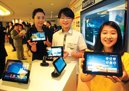 SK텔레콤은 18일 서울 광장동 워커힐호텔에서 국내 12개 교육 사업자 및 협회와 함께 태블릿PC를 이용한 스마트 러닝서비스 'T스마트러닝'을 선보이고 교육서비스와 첨단 정보통신기술(ICT)을 결합한 새로운 교육시대를 열었다.