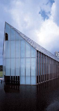 방주교회. 건물 외부를 둘러싼 물과 유리벽과 금속지붕, 나무 등 각기 다른 재료가 조화를 이룬다.