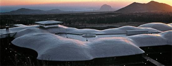 이타미 준이 설계한 포도호텔(2001)은 제주의 오름을 닮았으면서도 초가집 여러 채가 포도송이처럼 하나로 이어진 모습이다. 한국 건축가의 독창성을 추구한 그는 이 호텔 내부에도 한옥의 격자 창호와 서까래를 차용한 요소를 섬세하게 심어놓았다. [ITM건축연구소 제공]
