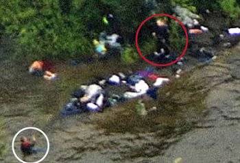 | 살려달라 비는 소년에게 총 겨눠 23일 노르웨이 우퇴위아 섬 물가에서 한 캠프 참가자(흰색 동그라미)가 자신을 향해 총을 겨누는 테러범 아네르스 베링 브레이비크(붉은색 동그라미)를 향해 살려달라며 빌고 있다. 사진 출처 데일리메일 |