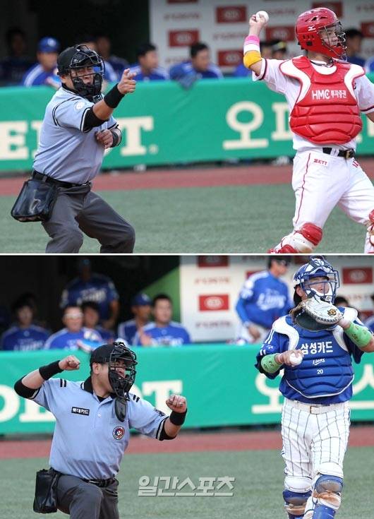 27일 광주 KIA-삼성전에서 김귀한 주심이 역동적인 포즈를 취하고 있다. 오른쪽을 향해 검지 손가락을 뻗는 자세(위)는 스트라이크, 양 주먹을 쥐고 팔꿈치를 굽히는 자세(아래)는 아웃 선언이다.