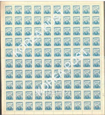 ↑ 지난 1955년에 발행된 '산업도안 보통우표20환 물결무늬 투문 전지'. 평가액이 1억6000만원에 달한다.(사진: 우정사업본부) |