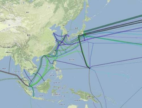 우리나라 주변을 보면 일본에서 미국으로 연결되는 고속 라인 사이에 한중일을 이어주는 광케이블 등 다양한 라인을 볼 수 있다. 전부 클릭해본 건 아니지만 전 세계에 깔린 200개의 해저 광케이블을 통틀어 가장 대용량은 일본과 미국 사이를 이어주는 7Tbps급 라인인 TGN-P인 것으로 보인다.