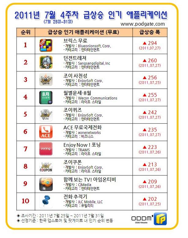[쇼핑저널 버즈] 애플리케이션 포털 팟게이트( www.podgate.com)가 7월 25일부터 7월 31일까지 한국 앱스토어의 인기 순위를 분석한 결과 벽돌 깨기 게임인 '브릭스 무료(Brix Free)'가 7월 마지막 주 급상승 인기 순위에 오른 것으로 나타났다.