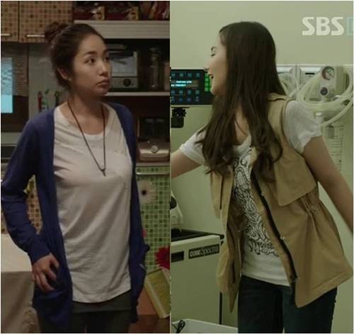 '나나룩'에 빠질 수 없는 캐주얼 스타일은 그녀만의 깜찍하고 시크한 스타을 보여줬다. 자칫 심심할 수 있는 화이트 티셔츠에 박민영은 가디건과 베스트를 활용해 지루함을 덜었다.