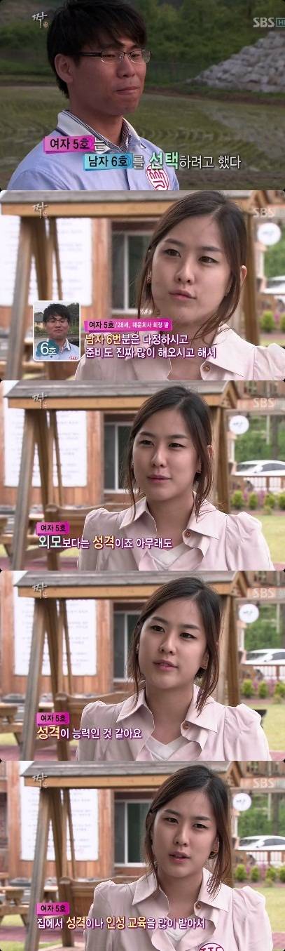 새침하고 도도할 것 같았던 여자 5호는 이러한 남자 6호에게 마음이 있었다. 예상치 못한 여자 5호의 마음에 제작진이 "외모보다는 성격이나 능력을 보는 것이냐"고 묻자 여자 5호는 "성격이 곧 능력이라고 생각한다"고 소신 있는 발언을 했다.