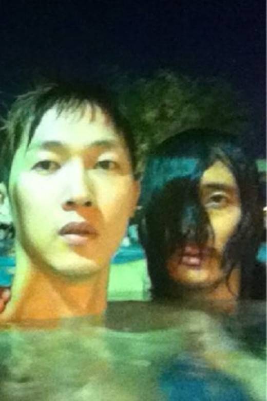 사진 속 신현준과 장우혁은 어둠이 짙게 까린 야외에서 목 밑으로 물에 담그고 있는 모습. 신현준은 얼굴의 반을 장발 머리로 가리고 있으며 장우혁은 무표정하다.