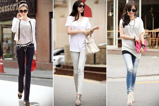 그레이 컬러 스키니진에 깔끔한 화이트 기본 티셔츠는 편안하면서도 순수한 느낌을 준다. 여기에 긴 생머리를 더하면 모든 남성들의 로망인 청순녀로 등극할 수 있다. 조금 더 캐주얼하고 발랄한 느낌을 주고 싶다면 살짝 찢어진 청바지에 루즈한 화이트 티셔츠를 매치하는 것도 좋은 방법이다.